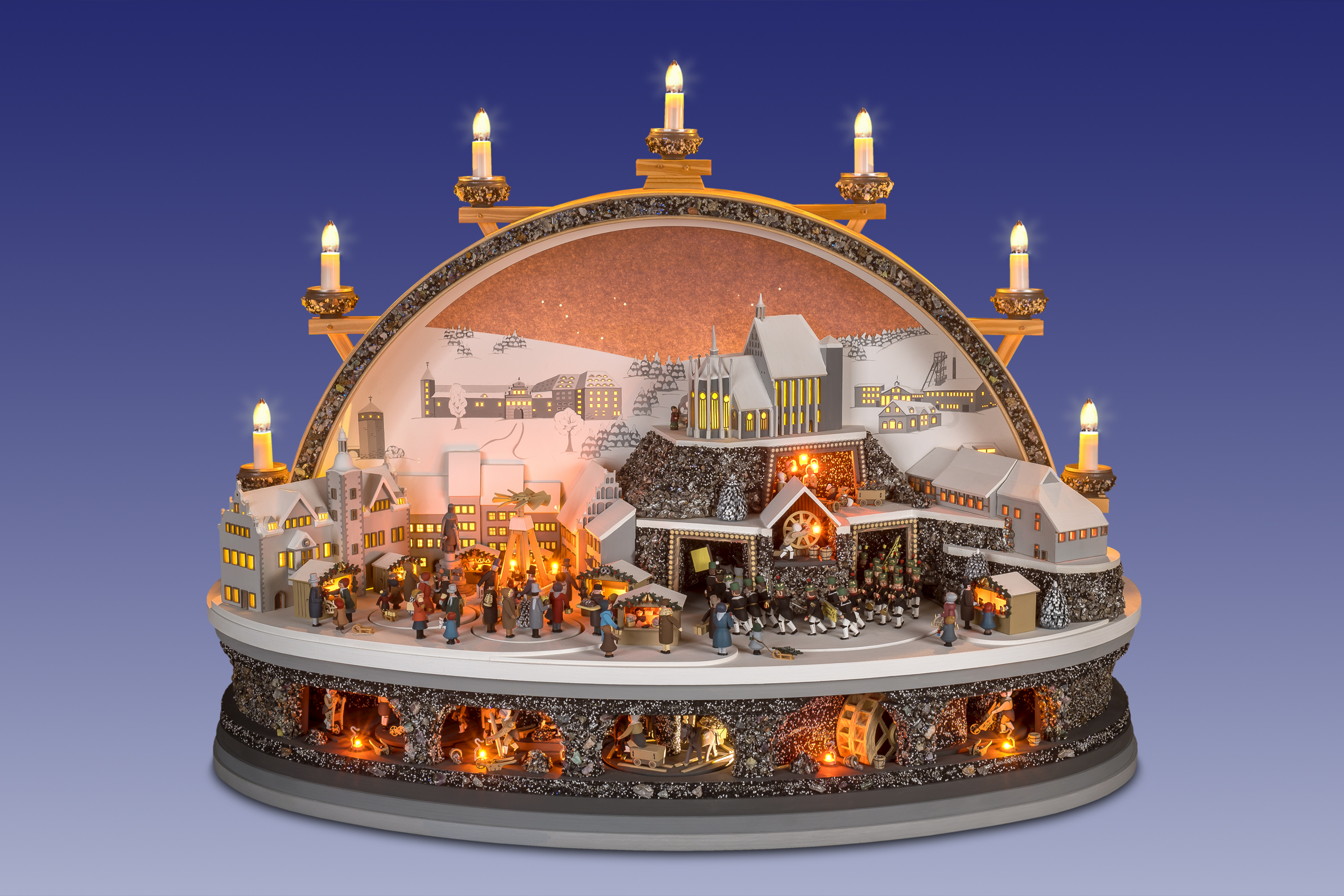 Natürlich sind Vergangenheit und Gegenwart nicht vergleichbar. Wichtig ist daher, dass wir uns beim Anblick der damaligen Lebensumstände ein wenig in Demut üben und die tapferen Bergleute in ehrender Erinnerung behalten. Das Silber, dass ihre Hände dem Berg abtrotzen, hat Freiberg zu der Stadt gemacht, die diese heute ist. Aber nicht nur Freiberg hat davon profitiert, die ganze Region ist daran gewachsen. Wir haben versucht, die Schwere der Arbeit darzustellen und sind auch auf einzelne schon fortschrittlichere Techniken des Bergbaus eingegangen, wie zum Beispiel das Kehrrad und die Huntebahn, die von Pferden gezogen wird. Beides ist im Sockel des Schwibbogens zu finden.